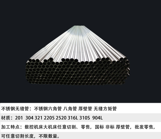304不锈钢复合管材:产品特点:耐腐耐磨抗高温、耐压等。适用行业;金属制品、机械制造、产品规格:冷轧,热轧,切割,折弯。不锈钢焊管、方管,表面可抛光拉丝酸洗。数控机床大机床任意切割、零售,国标非标厚壁管。