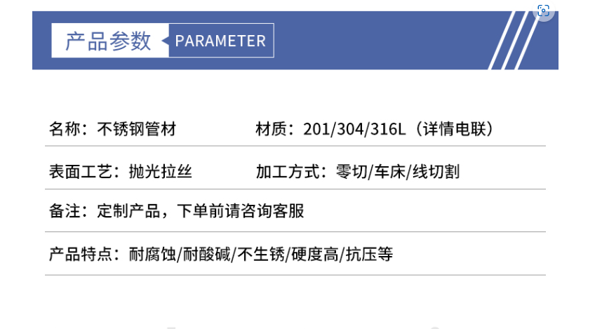 316不锈钢精密圆管:表面工艺:抛光拉丝 加工方式:零切/车床/线切割。产品特点:耐腐蚀/耐酸碱/不生锈/硬度高/抗压等。不锈钢表面薄而致密的富铬氧化膜,使得不锈钢管不易氧化,有良好耐腐蚀性,不锈使用寿命长,寿命周期内几乎不需要维···