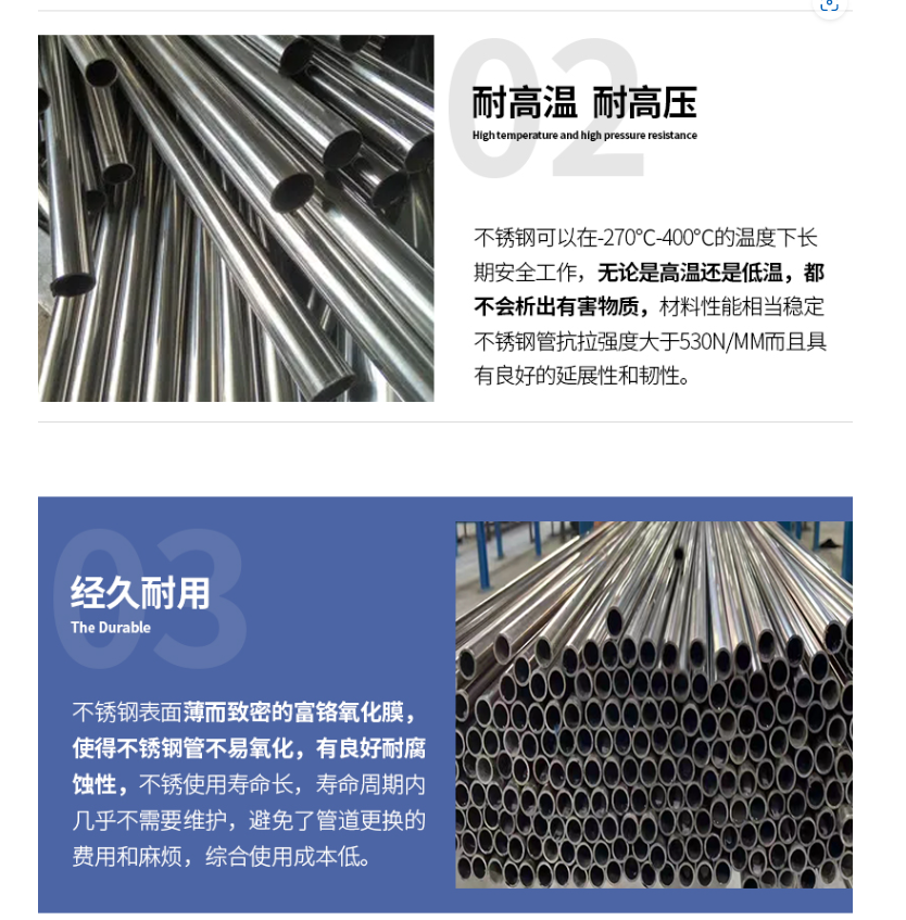 不锈钢表面薄而致密的富铬氧化膜,使得不锈钢管不易氧化,有良好耐腐蚀性,不锈使用寿命长,寿命周期内几乎不需要维护,避免了管道更换的费用和麻烦。