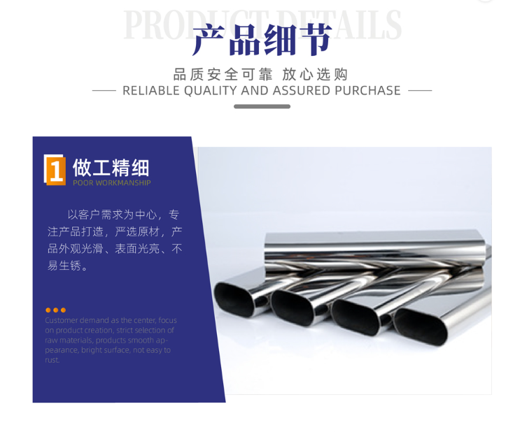 不锈钢平椭圆管:良好的防腐、耐压性,强度高,不易变形,高韧性,表面 光亮美观,使用寿命长等主要用于安全防护、洁具卫浴、机械设备、家具灯具、 五全配件、汽车配件、医疗防护等用途。